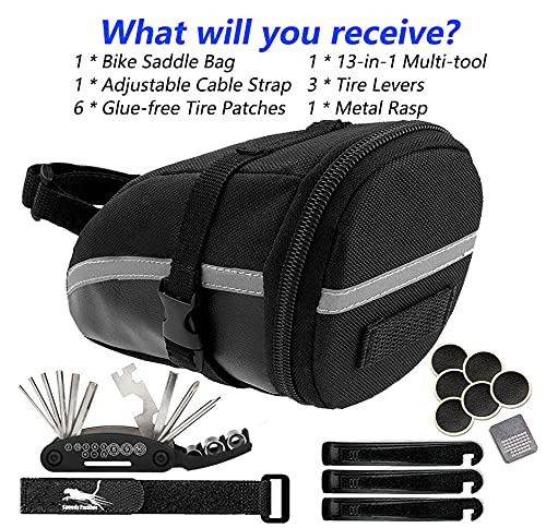 【Full Function Bike Kit Bag】 — With 13 in 1 tool kit which can fix most of problem during riding, 3 chain hooks help to hold links when splitting and assembly, the bike saddle bag can storage items you want to carry.