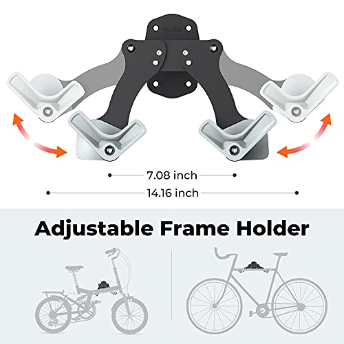 Adjustable Length/Width: 5 Levels Setting-Adjustable cradle arms ensure that most size and shape bicycle frames can be accommodated ,and fit all environments and widths of bicycles. With 9-12.6inch adjustable length, 7-14 inch adjustable width, this bike wall mount can fit most bike like road, hybrid and MTB. Just simply press the button on the hanger and done! (Note: Not suitable for fat bikes or bikes with wide handlebars (31 inches / 78 cm) and long wheelbase.)